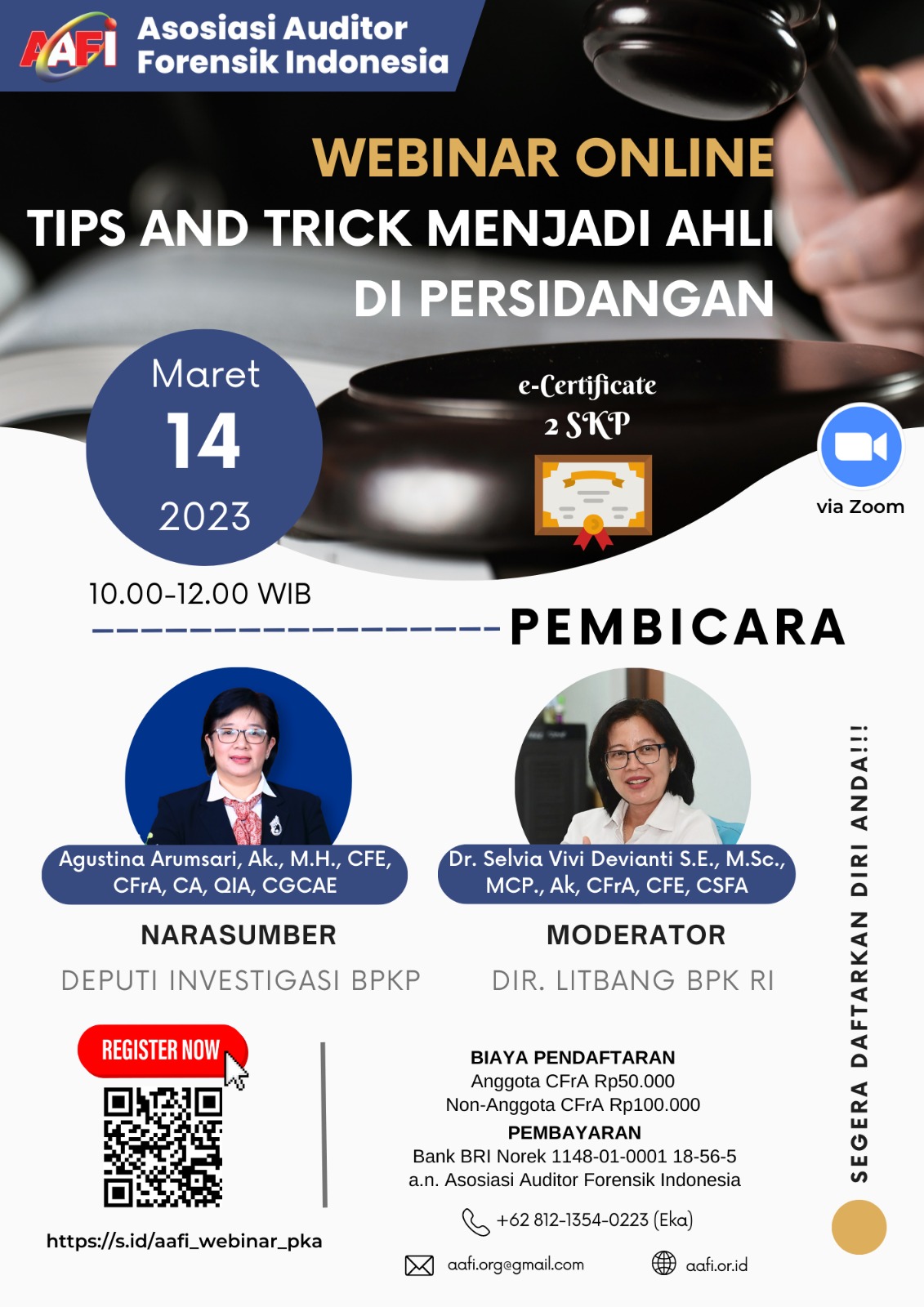 Asosiasi Forensik Auditor Indonesia (AAFI TEPOGI) mengundang Bapak/Ibu dalam Webinar Online dengan Tema "TIPS AND TRICKS MENJADI AHLI DI PERSIDANGAN"