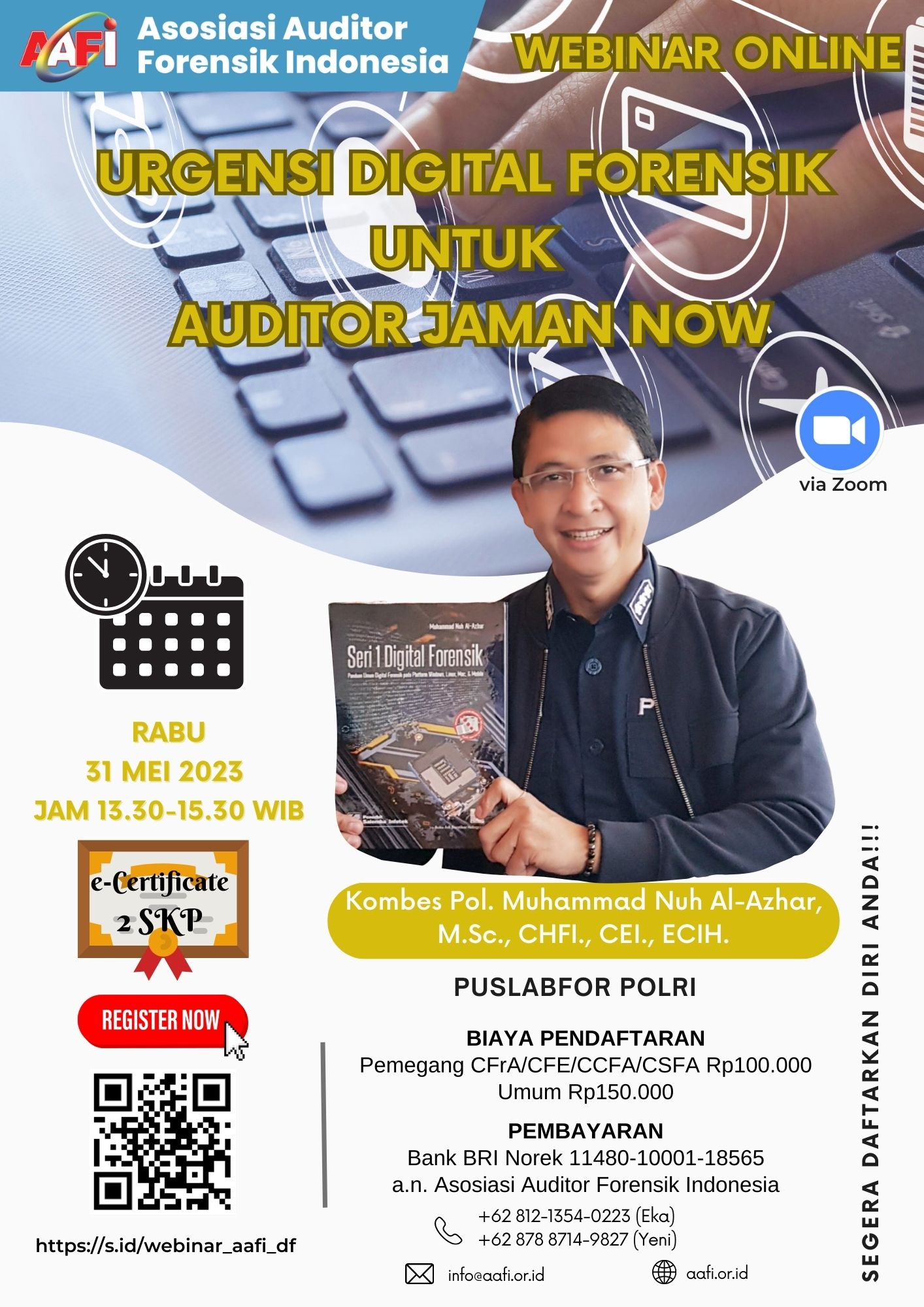 Asosiasi Forensik Auditor Indonesia (AAFI TEPOGI) mengundang Bapak/Ibu dalam Webinar Online dengan Tema "URGENSI DIGITAL FORENSIK UNTUK AUDITOR JAMAN NOW" yang menghadirkan Ahli Digital Forensik, Komisaris Besar Polisi Muhammad Nuh Al-Azhar, S.T., M.Sc., CHFI., CEI., ECIH. dari PUSLABFOR POLRI.